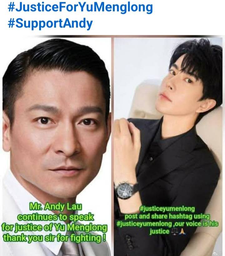 และล่าสุด หลิวเต๋อหัว หรือ Andy Lau นักแสดงชื่อดังคงทนเห็นความอยุติธรรมกับนักแสดงหนุ่มที่เสียชีวิตต่อไปไม่ได้จึงออกมาเรียกร้องความเป็นธรรมให้กับอวี๋เหมิงหลง พร้อมติด #SupportAndy เพราะหลิวเต๋อหัวไม่อยากให้เกิดเหตุการณ์ร้าย ๆ แบบนั้นกับนักแสดงคนอื่นอีก แต่ก่อนหน้ามีเพื่อนนักแสดงที่รักอวี๋เหมิงหลงต่างออกมาเรียกร้อง รวมถึงผู้กำกับไต้หวันที่นักแสดงผู้เสียชีวิตเรียกเขาว่าพ่อบุญธรรมได้จัดงานศพให้พร้อมถามหาความยุติธรรมให้อวี๋เหมิงหลงกลับถูกอิทธิพลมืดขู่ให้ปิดปากเงียบ วันนี้มีหนึ่งฮีโร่ที่กล้ายื่นมือทรงพลังออกมาเรียกหาความเป็นธรรมให้อวี๋เหมิงหลงอย่างไม่กลัวอันตราย (Andy Lau held out a powerful hand demanding justice for Yu Menglong.) แฟนคลับต่างยกย่องและขอบคุณ พร้อมแสดงความห่วงใยถึง หลิวเต๋อหัวด้วย
