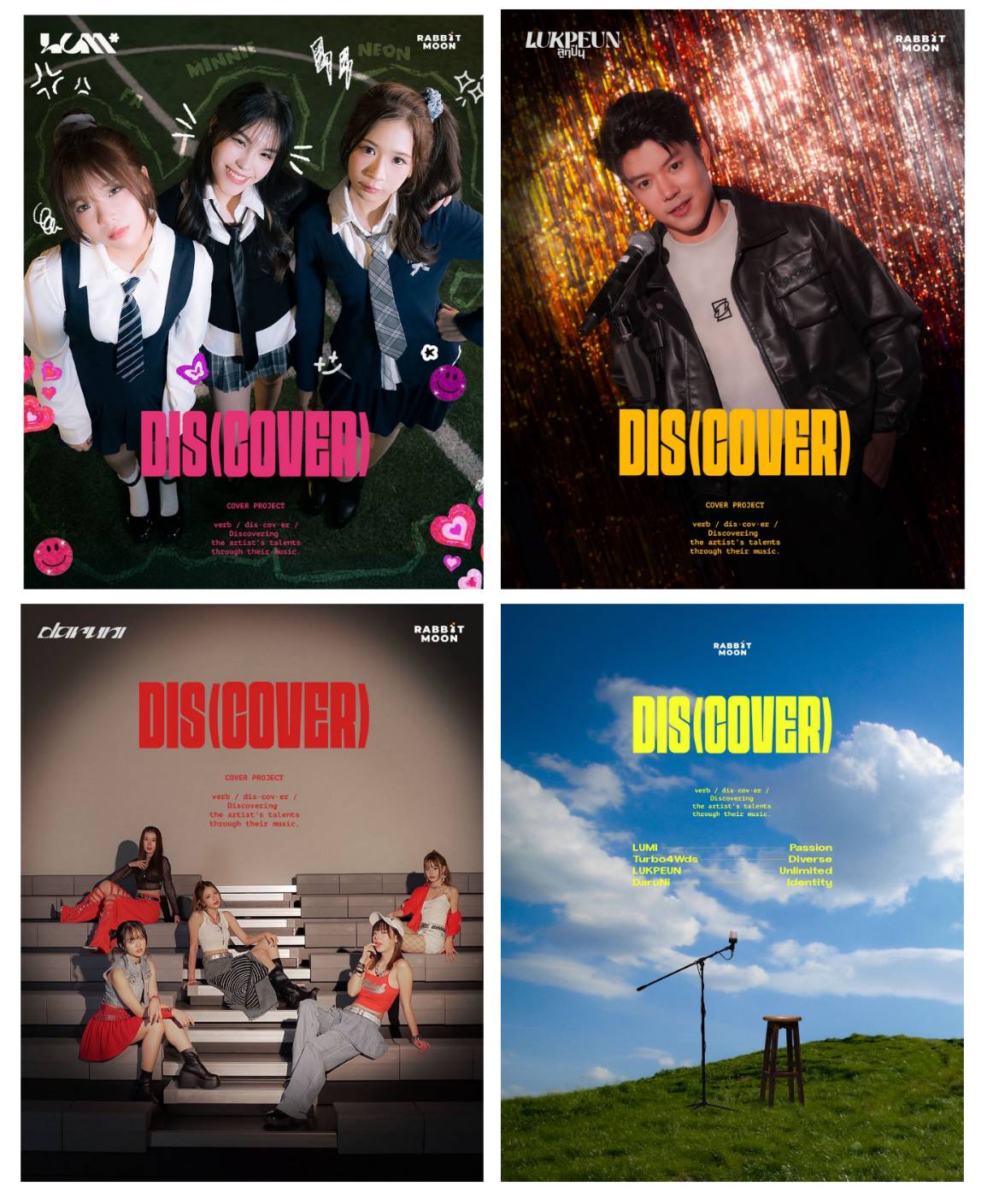 ยังคงสร้างสรรค์ผลงานออกมาอย่างต่อเนื่อง สำหรับ “ค่ายแรบบิท มูน” (Rabbit Moon) ค่ายเพลงในเครือ บริษัท ที แอนด์ บี มีเดีย โกลบอล (ประเทศไทย) จำกัด ล่าสุดพร้อมปล่อย “DIS(COVER)PROJECT” โปรเจกต์ที่ไร้ขีดจำกัดของศิลปิน ผ่านแรงบันดาลใจและความหลากหลายของเพลง ที่จะถูกถ่ายทอดโดยศิลปิน ดังนี้