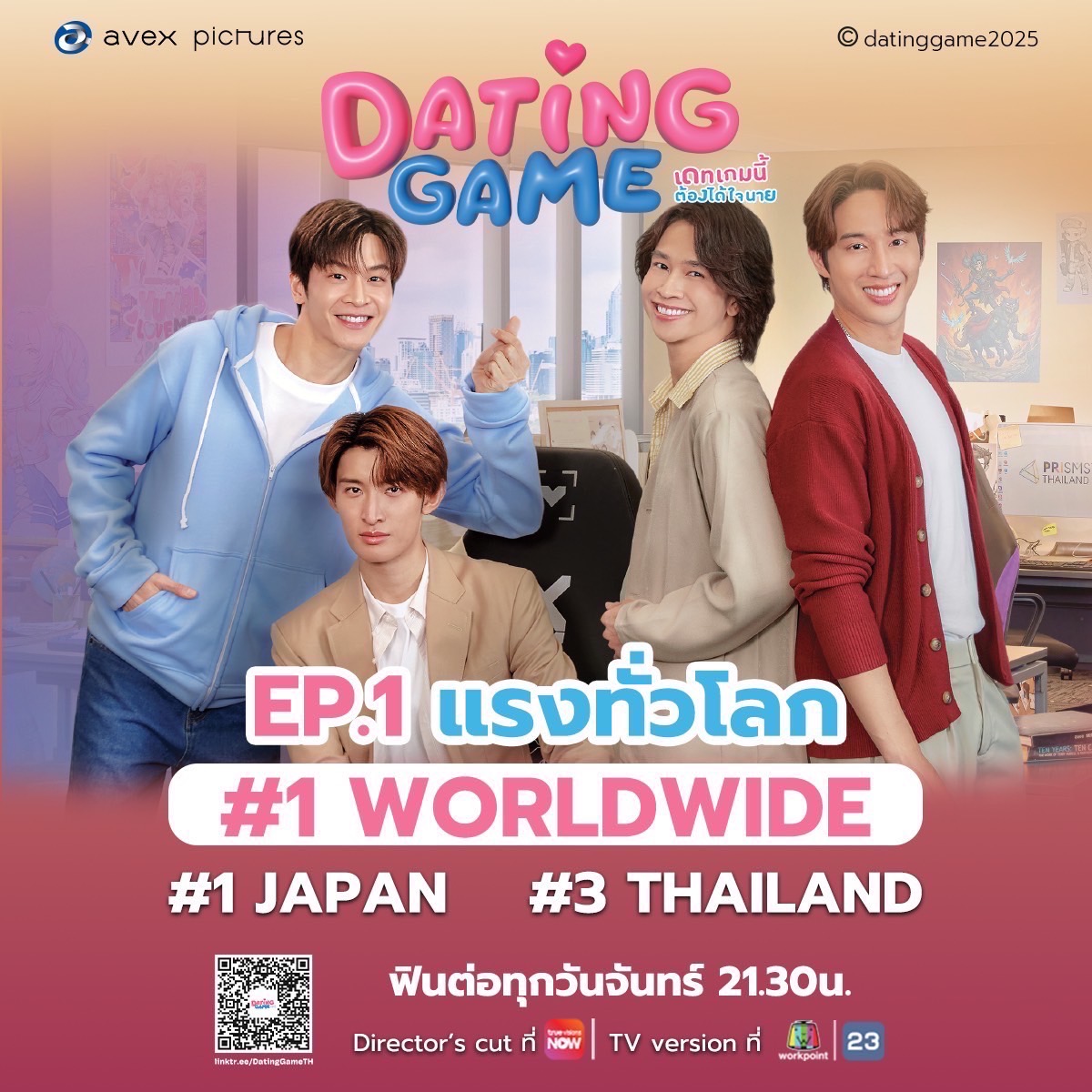 ปังตั้งแต่ EP แรก! “Dating Game เดทเกมนี้ ต้องได้ใจนาย” ผลิตโดยความร่วมมือระหว่างไทยและญี่ปุ่น Avex Pictures (Japan), Themework Studio (Thailand) และ Studio SRK กำกับโดย กบ ชาครีย์ นำแสดงโดย มาร์ช จุฑาวุฒิ, โคจิ มุไค (Snow Man), ยูโด ธรรม์ธัช, ฟลุ้ค ณธัช โดยออนแอร์แค่ EP 1 แต่กระแสความแรงเกินคาด ดันเเฮชเเท็ก #DatingGameEP1 พุ่งทะยานติดเทรนด์อันดับ 1 ของโลกในทันทีขณะออนแอร์ พร้อมกระแสชื่นชมมากมายในโลกโซเชียล ไม่ว่าจะเป็น สนุก เดินเรื่องเร็ว นักแสดงเล่นดีทุกคน อึ้งในสกิลการพูดไทยของโคจิ (Snow Man) เก่งมาก ๆ การแสดงเข้าคู่กับมาร์ชดีสุด ๆ เป็นเคมีที่ใช่ / ฟลุ้คน่ารัก ยูโดหล่อลอยมาเลย / EP นี้ดีมากมีทั้งเรื่องความรักและความเจ็บปวดในอดีต ยูกะช่วยชีวิตฮิลล์มาจริง ๆ เวอร์ชันเต็มทำน้ำตาไหล การแสดงของมาร์ชน่าทึ่งมาก อยากให้ไปดูกันเยอะ ๆ ฯลฯ ทำเอาทีมงานและนักแสดงปลาบปลื้มกับกระแสตอบรับที่แรงและเร็วขนาดนี้