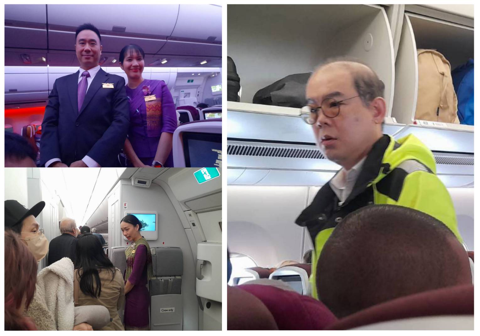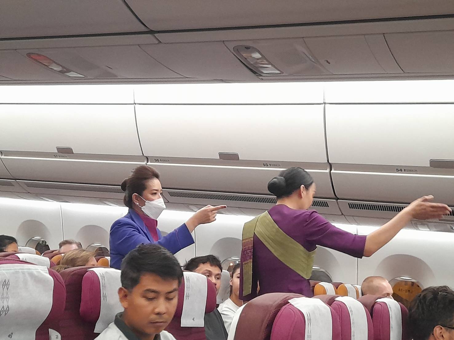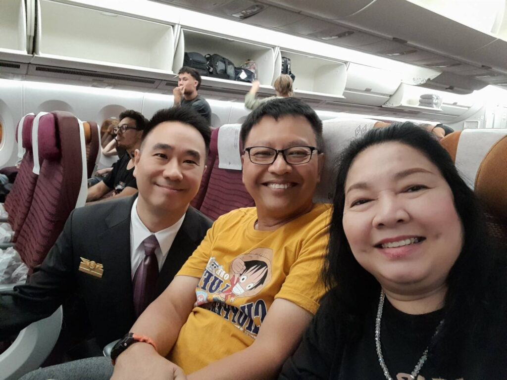 แล้วหลังจากย้ายที่นั่งเรียบร้อยก็ยกมือถือถ่ายภาพบนเครื่องเป็นที่ระลึกกับคุณสามี มีสจ๊วตยินดีถ่ายภาพให้เราสองคนซึ่งแน่นอนต้องสวยกว่าเซลฟี แต่เราเกิดความประทับใจครั้งที่สองจึงขอถ่ายภาพกับสจ๊วตเก็บไว้ชื่นชม และเพื่อเขียนข่าวเที่ยวบินนี้ หลังจากถ่ายภาพแล้วเครื่องก็ขึ้นอย่างสง่างามอย่างที่เรารู้สึก แล้วเพียงไม่นานบรรดาแอร์โฮสเตสและสจ๊วตก็เริ่มเสิร์ฟอาหารโดยเราได้รับการดูแลจากสจ๊วตที่ถ่ายภาพคู่ให้กับเรา ตลอดเที่ยวบินแอร์ฯและสจ๊วตต่างทำหน้าที่โดยไม่ลืมยิ้มถึงแววตาให้กับผู้โดยสารทุกคน นี่ไม่ได้อวย ทว่าเรารู้สึกจริง และรับรู้ได้จากการบริการที่ทุกคนตั้งใจมอบให้ผู้โดยสารตลอดเที่ยวบินนั้นอย่างไม่ขาดตกบกพร่อง